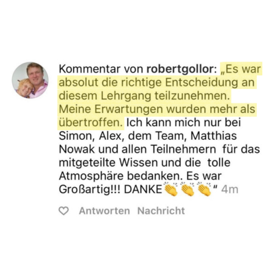 Deine Ausbildung beinhaltet eine 100% Geld-zurück-Garantie. Sollte die Ausbildung nicht deinen Erwartungen entsprechen, informierst Du uns und erhältst sogar nach der Veranstaltung den vollen Kaufpreis wieder - ohne wenn und aber. Wir sind überzeugt von der Qualität unserer Ausbildung!
